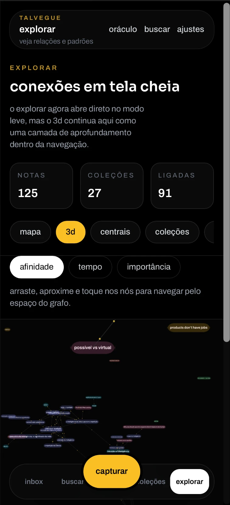 Talvegue is the project where this line of work becomes most explicit. It started as a kind of second brain, but gradually evolved into something closer to a living knowledge graph. The goal was never just to store notes, links, images, and audio, but to turn that material into a navigable body of knowledge.