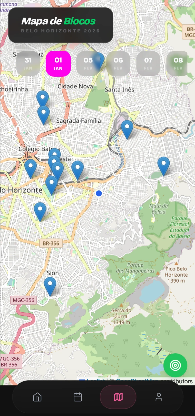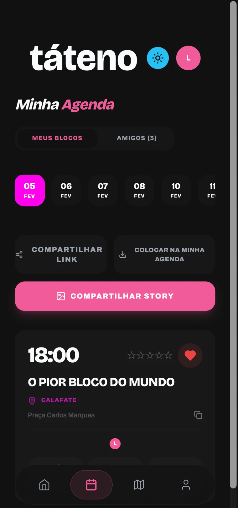 Táteno came from a very different need: social coordination during Carnival, where time, movement, and proximity matter more than permanence. The original idea was to make it easier to share user's Carnival plans with other people, while also creating an ephemeral tool for discovering nearby blocos during the days of the festival.