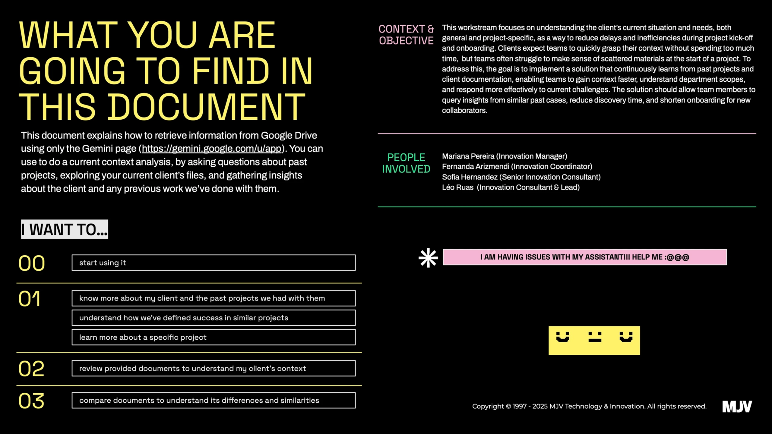 At the same time, the organization had accumulated a large volume of project documentation stored in Google Drive. In theory, knowledge already existed. In practice, accessing that knowledge depended on knowing where to look or asking someone who had worked on the project before.