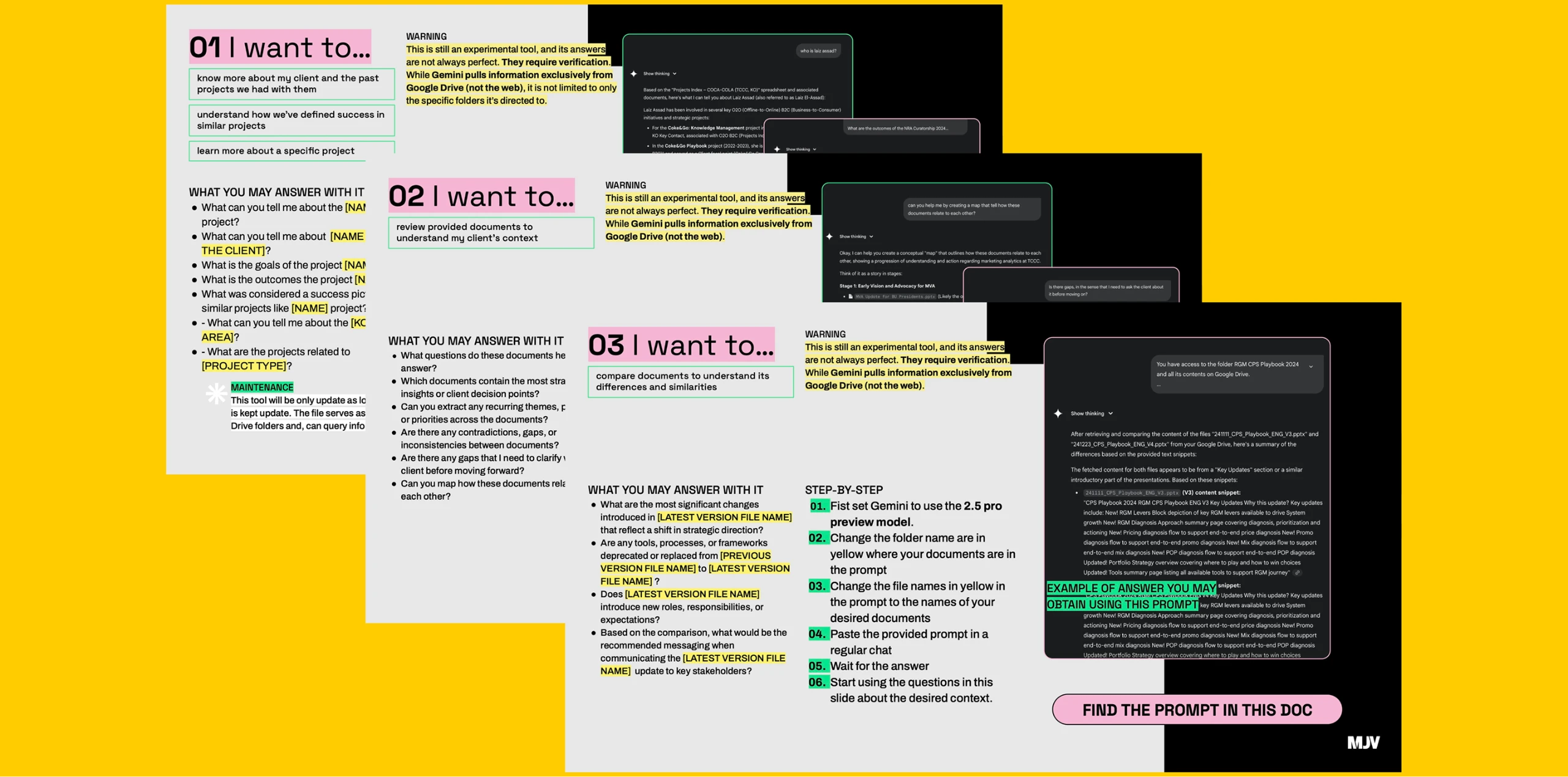 On top of this structure, I designed prompt-based interactions that enabled different uses. Team members could retrieve past context, identify similar projects, understand success criteria, analyze documents, and generate new outputs based on existing materials.